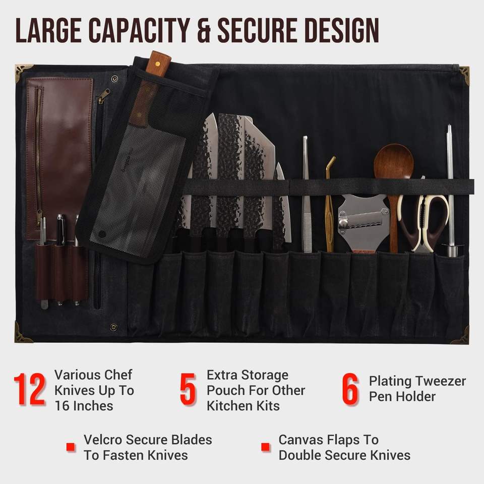 Échantillon gratuit : Sac à couteaux de chef avec 20 poches au total pour couteaux et ustensiles de cuisine, en nylon ciré résistant aux taches, pour étudiants en cuisine