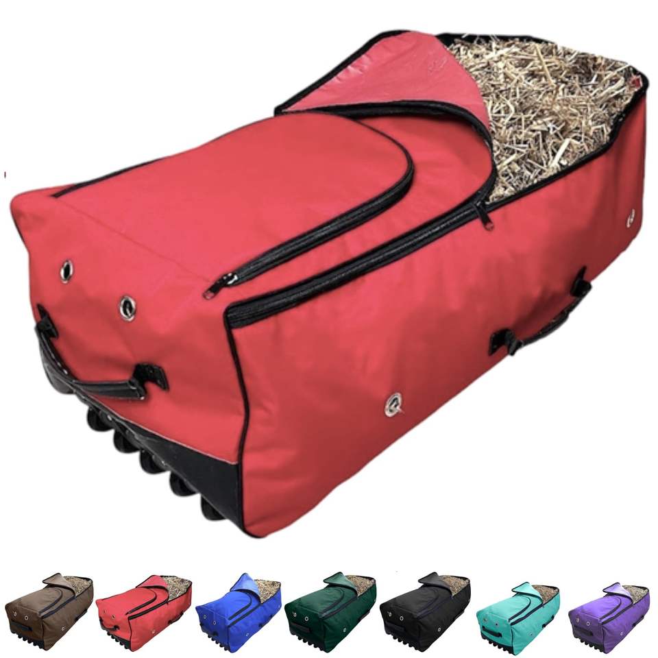 Échantillon gratuit, sacs à foin personnalisés à roulettes BSCI, grande capacité, mangeoire d'angle pour chevaux, sac de stockage de balles de foin d'angle profond