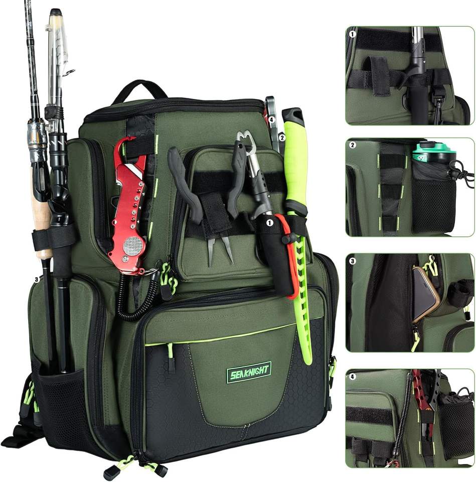 Sac à dos de pêche gratuit avec porte-cannes - 4 boîtes à accessoires - Housse de pluie, 43L de grand espace de rangement pour l'équipement de pêche