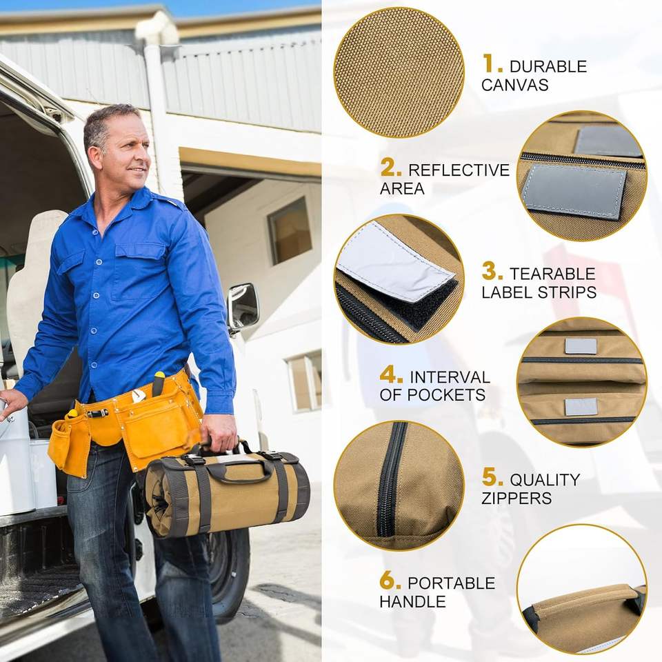 Échantillon gratuit : Sac de rangement enroulable robuste et résistant à l'eau pour outils, avec 7 poches zippées pour transport suspendu