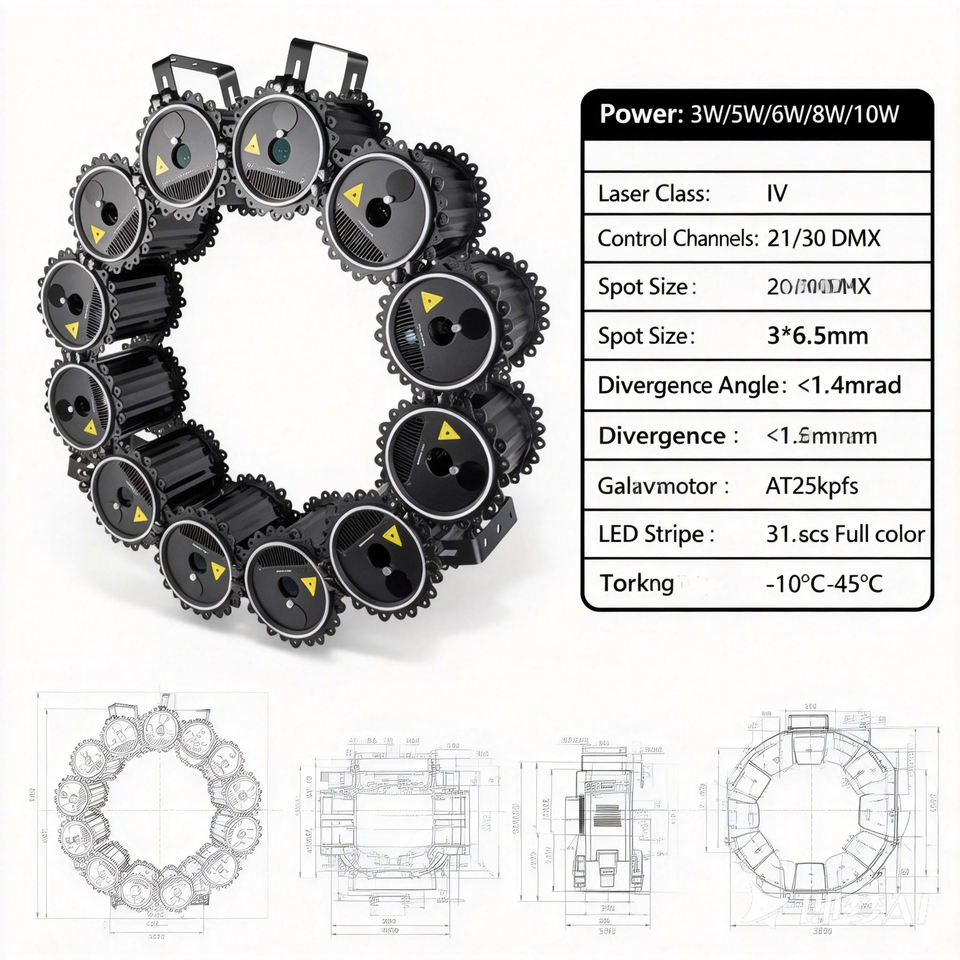 Freely Spliceable AT25Kpps Laser Projector 3-10W Power 200+ Effects 10000H Lifespan DMX ILDA Sound Control Stage Club Event