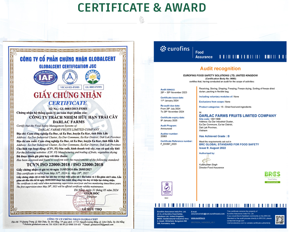Certification:BRCGS, ISO 22000:2018