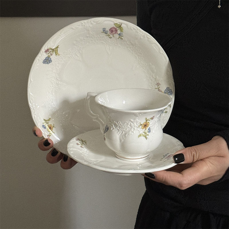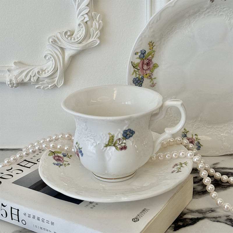 Ensemble de soucoupe de tasse à café en céramique de soulagement rétro de Style de cour française conception mignonne exquise de fleur pour le mariage pour le petit déjeuner après-midi