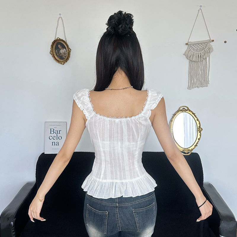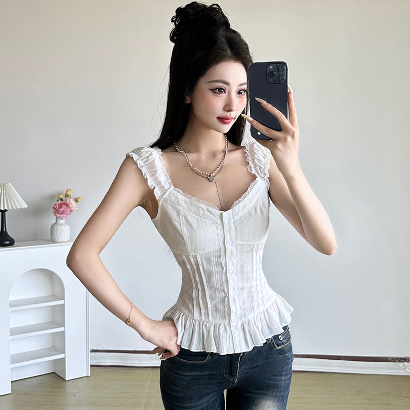 Chemisier en dentelle style féminin français, col en V, texture texturée, coupe ajustée, sans manches, haut d'été pour femme