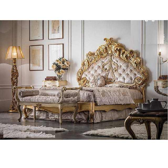 Lit en bois de teck de style français avec table de chevet, lit queen size doré avec table de chevet, lit en bois de style baroque avec tables de chevet