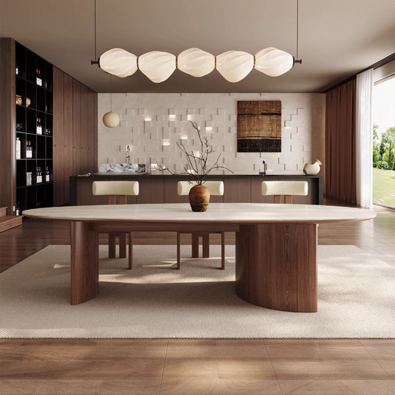 Ensemble de table à manger ovale en pierre de style moderne français, meubles d'appartement assemblés pour salon et restaurant