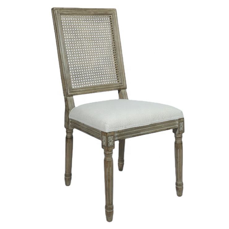Chaise Louis Xv de salle à manger en bois à dossier carré de Style Antique Provincial français avec dossier en rotin