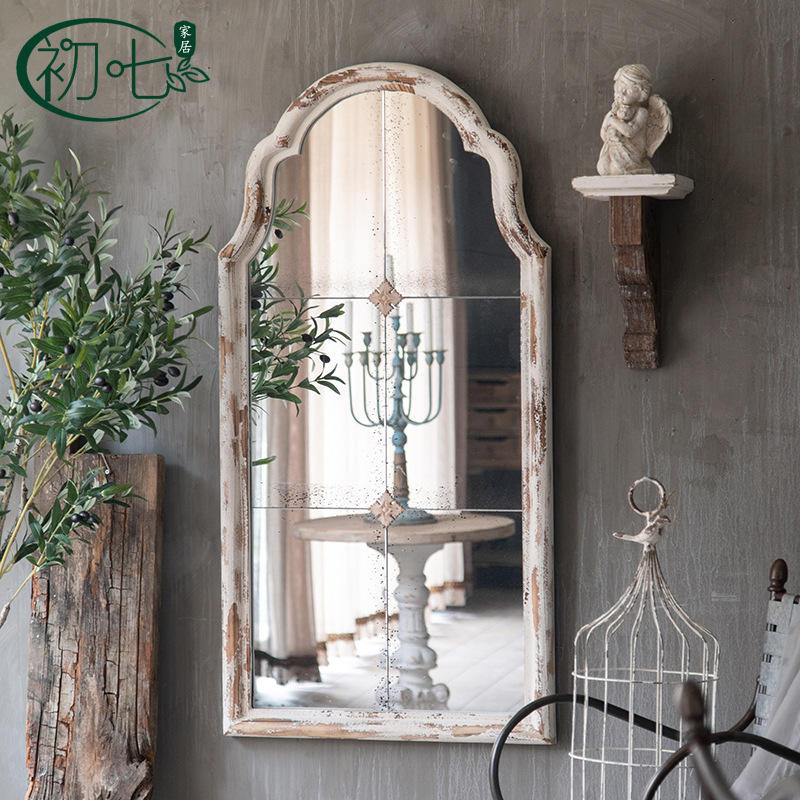 Miroir mural arqué rétro français, cadre en bois vieilli, verre argenté, décoratif pour salon, chambre, magasin de vêtements, cabine d'essayage