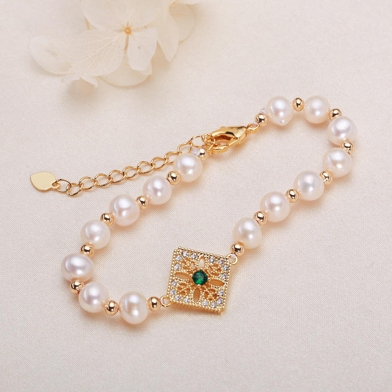 Bracelet de charme tendance en or 14 carats de style forêt rétro français, micro-zircon injecté, perle d'eau douce de 6 mm, cadeau pour meilleur ami