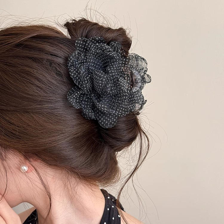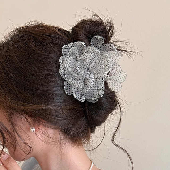 Nouvelle pince à cheveux requin style rétro français gris en tissu maillé avec fleur perlée pour femme, pince à cheveux florale douce