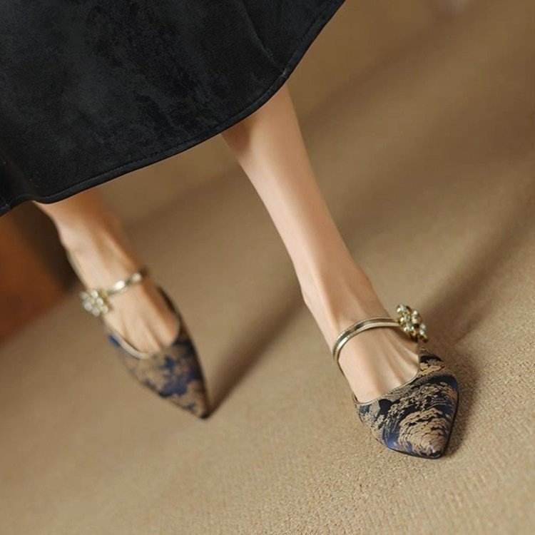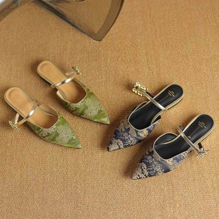 Sandales rétro françaises à bout pointu en toile et denim pour femmes, brodées style chinois, demi-chaussons, motif floral vert et bleu, 3-5 cm