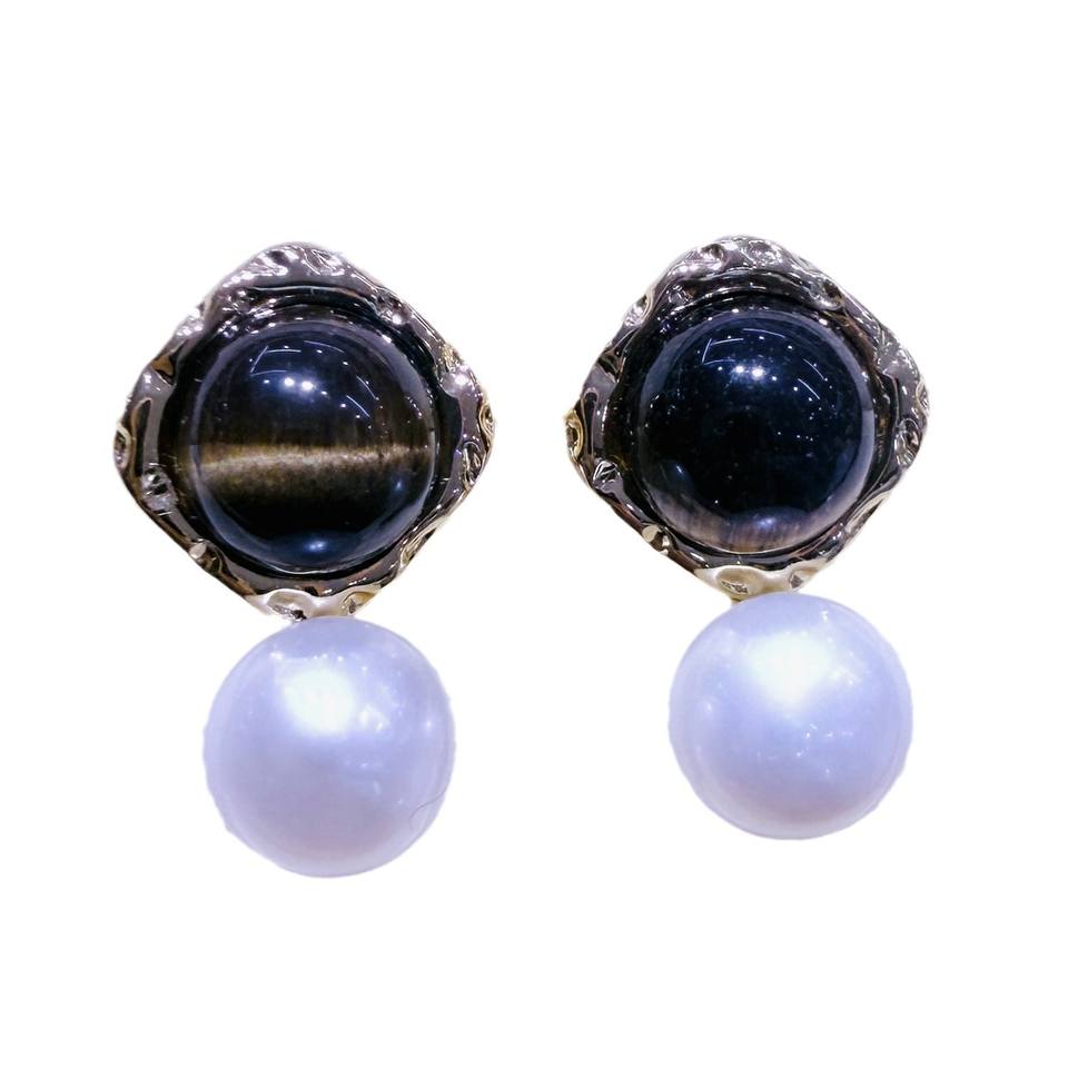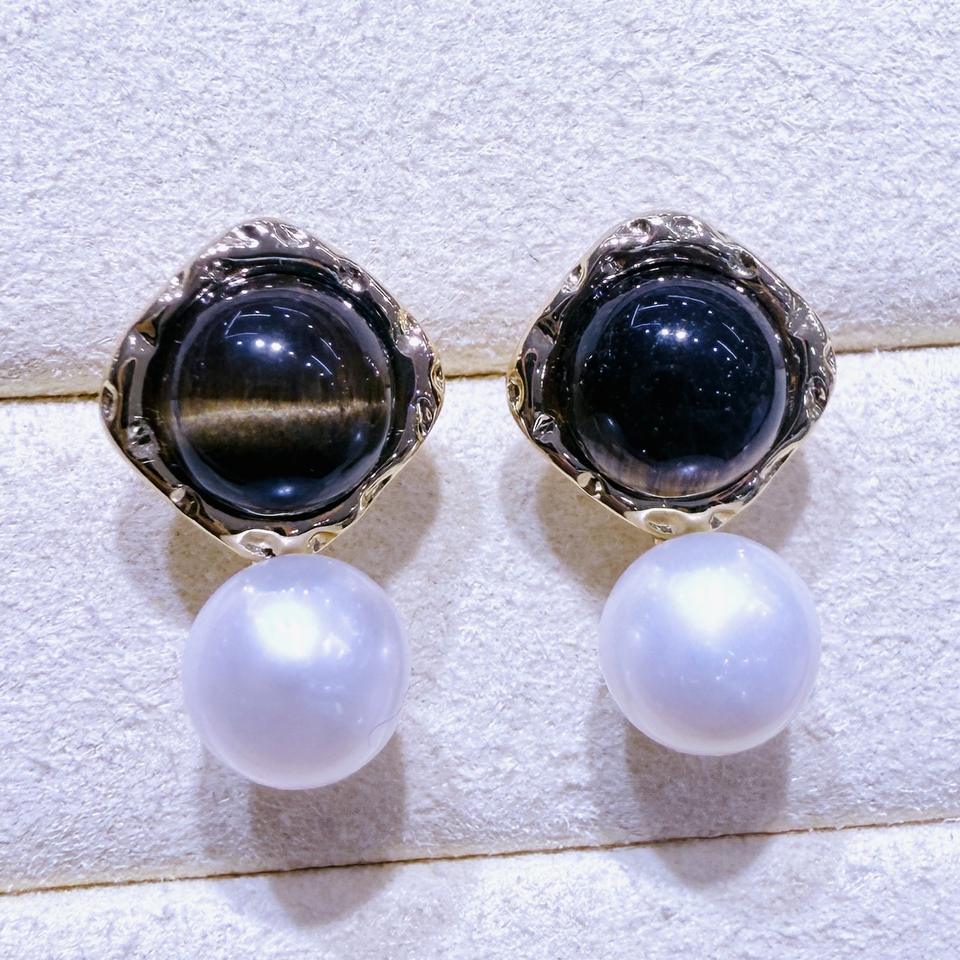 French Retro Vintage Fashion Dangle Earrings Simple Versatile Tiger Eye Stone and Freshwater Pearl Wholesale From Zhuji Origin