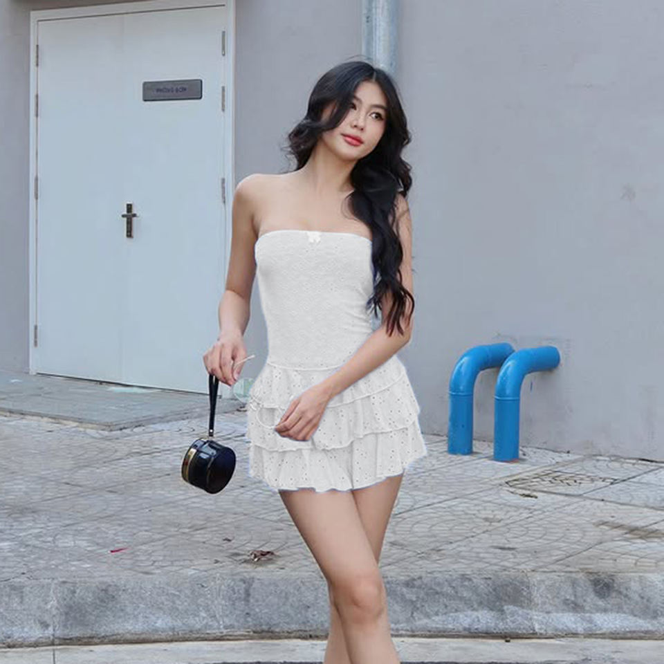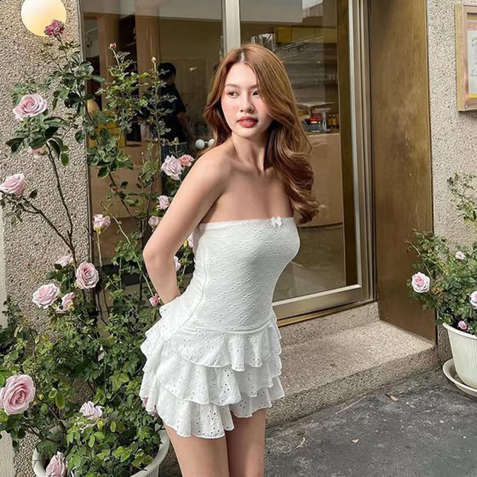 Robe Courte Romantique Française en Dentelle Épaules Dénudées pour Femme, en Tissu Jacquard, Taille Cintrée, Robe à Volants Superposés, Élégante et Légère pour Soirée