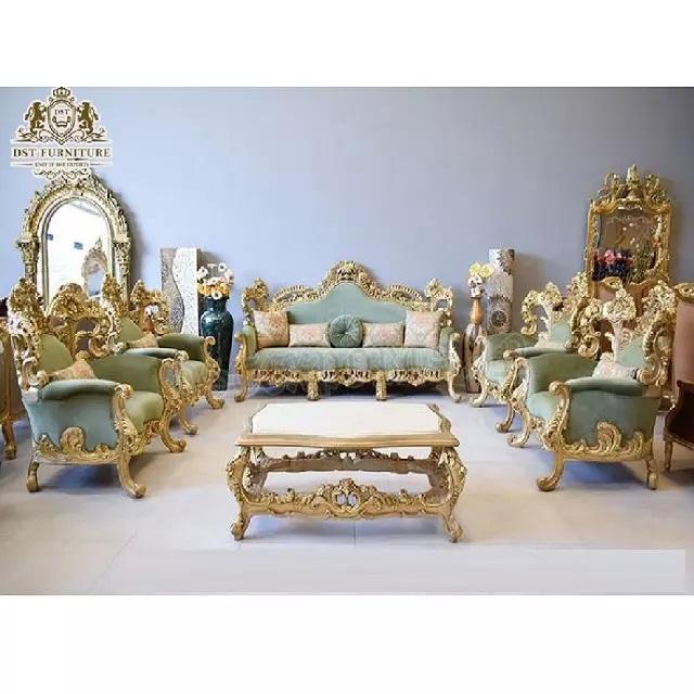 Ensemble de canapés victoriens en bois sculpté à la main, Style français, finition dorée, Style classique, 7 places, pour salon