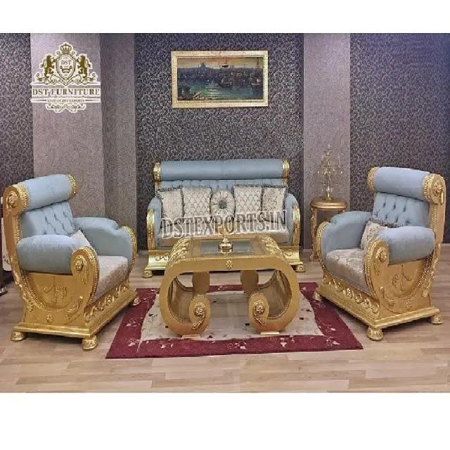 Ensemble de canapé et de fauteuil de salon de style français, ensemble de canapé de luxe en bois de teck sculpté antique doré, ensemble de salon en bois de teck poli doré antique, Royaume-Uni