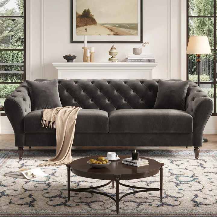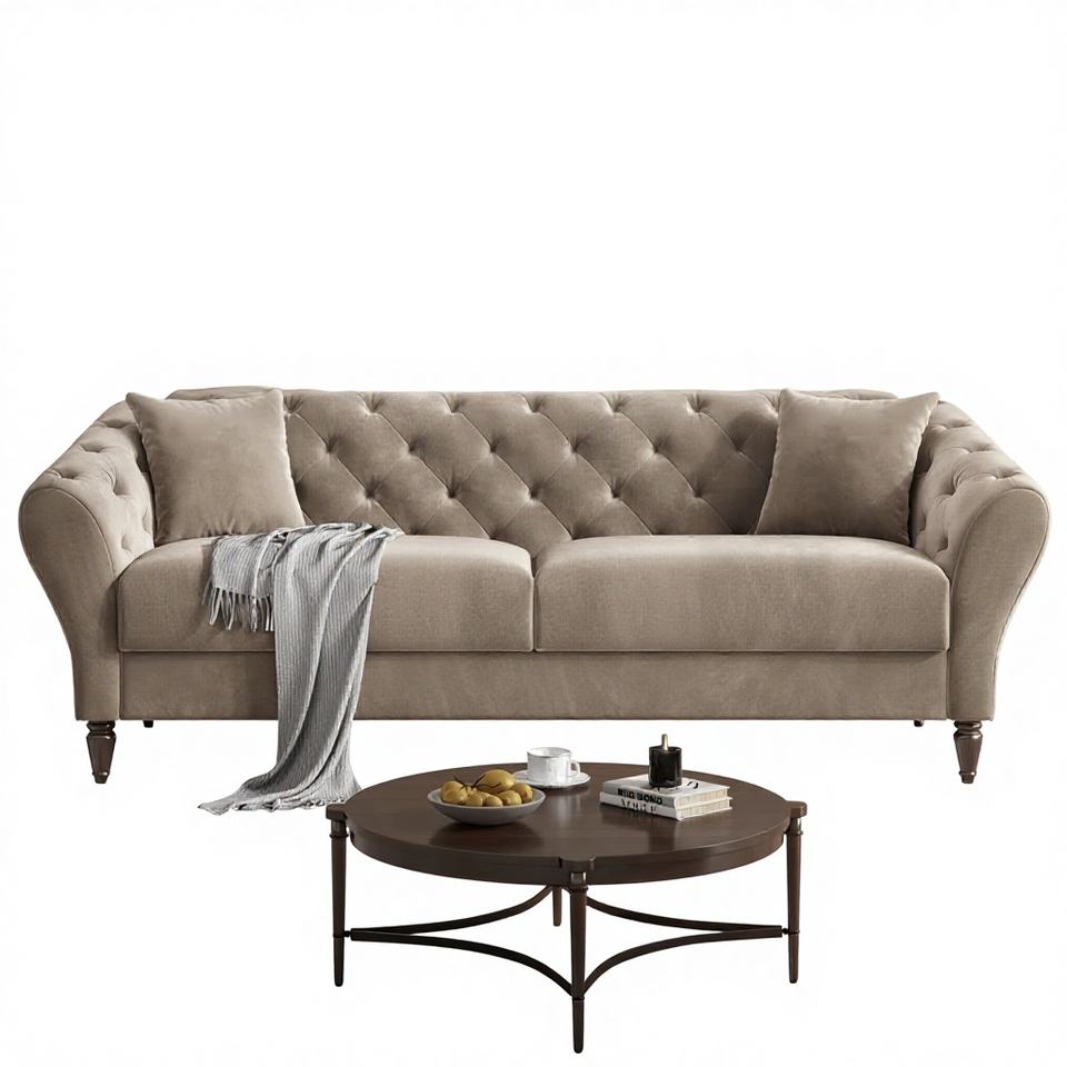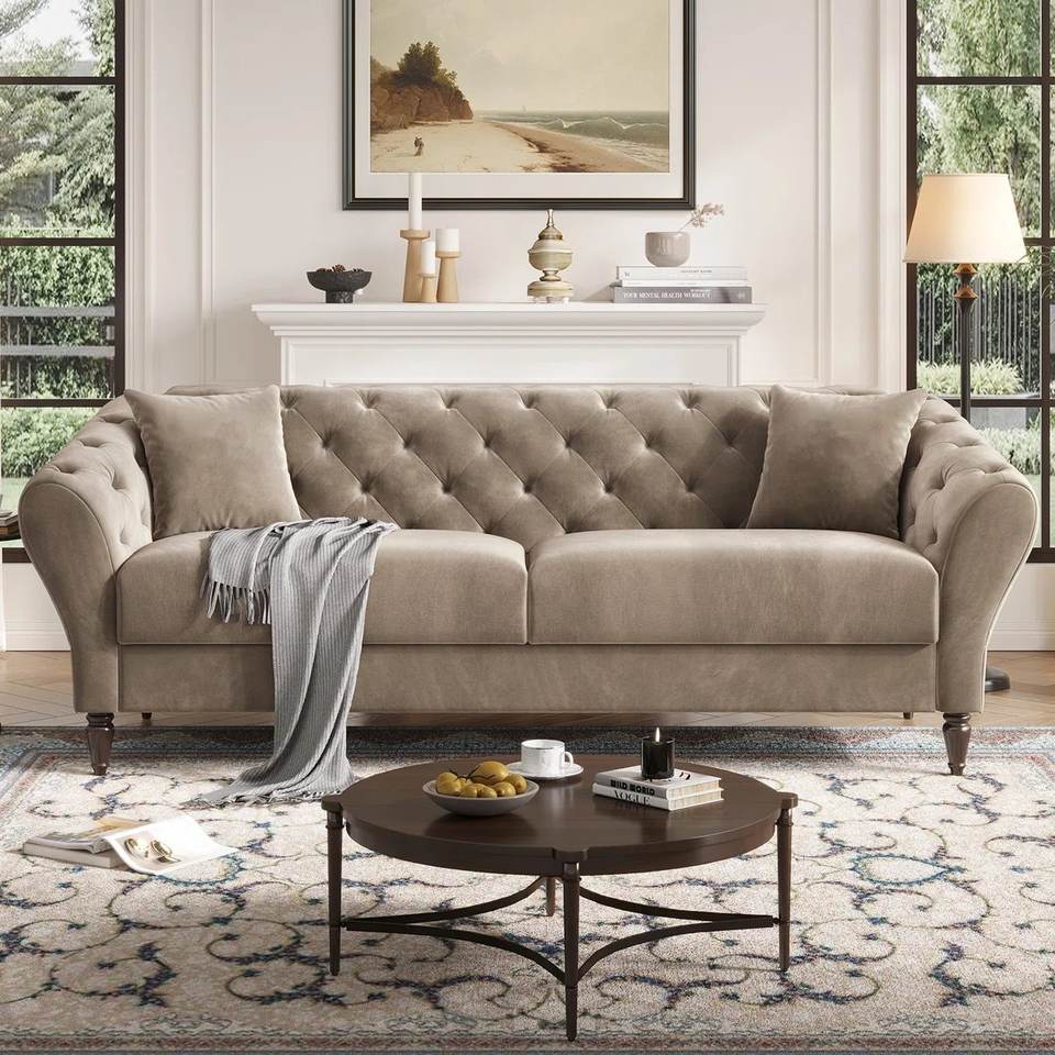 Canapé trois places en velours de style rétro français pour salon, avec mousse haute densité, boutons capitonnés classiques, style nordique personnalisé