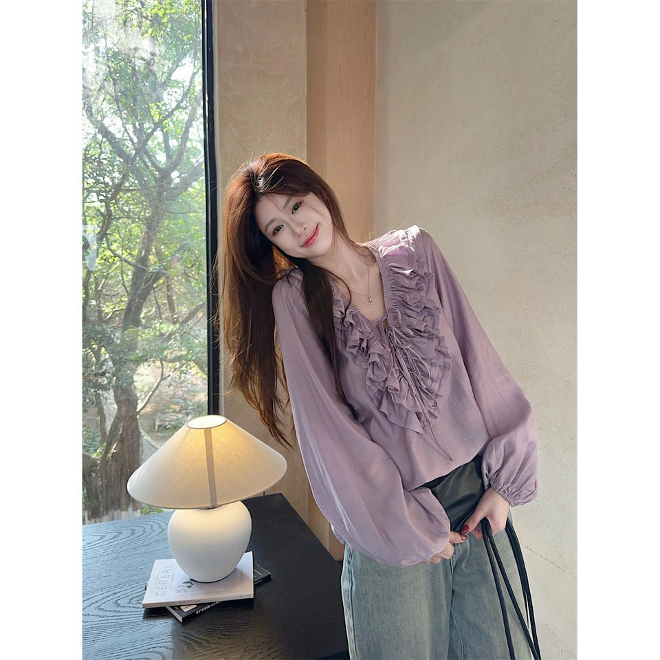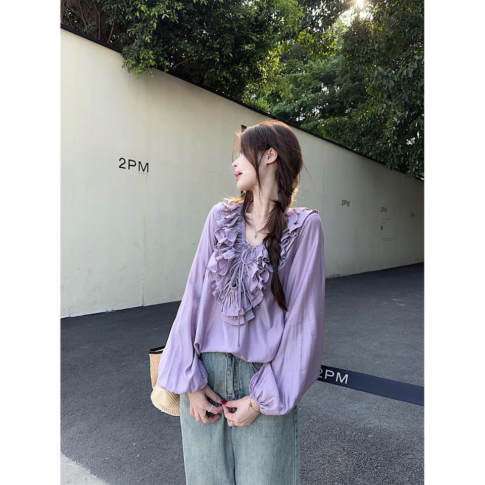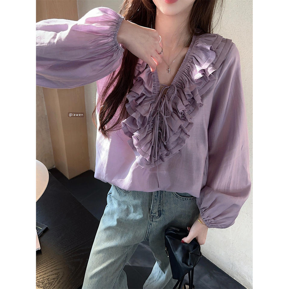 Chemise à volants florale à col en V de style français, manches longues en mousseline de soie, vêtements décontractés pour femmes, couleur violette, pour le printemps