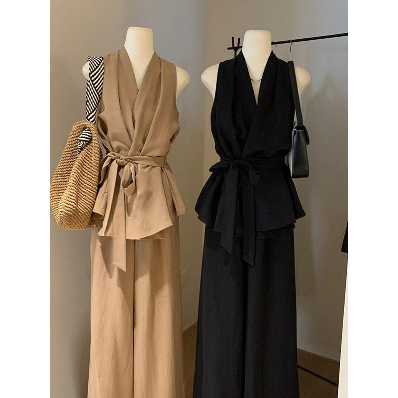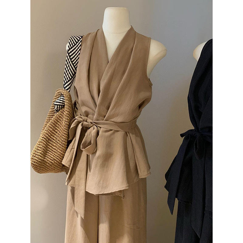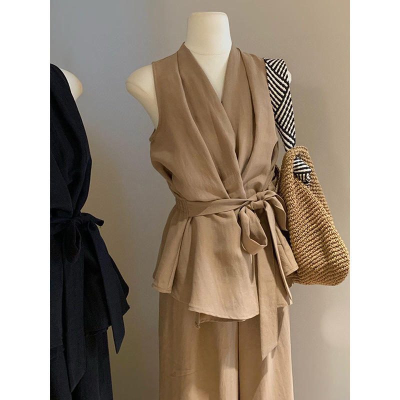 Ensemble pantalon large et débardeur croisé à col en V style français pour femme – Formel, sans manches, minimaliste, couleur unie douce