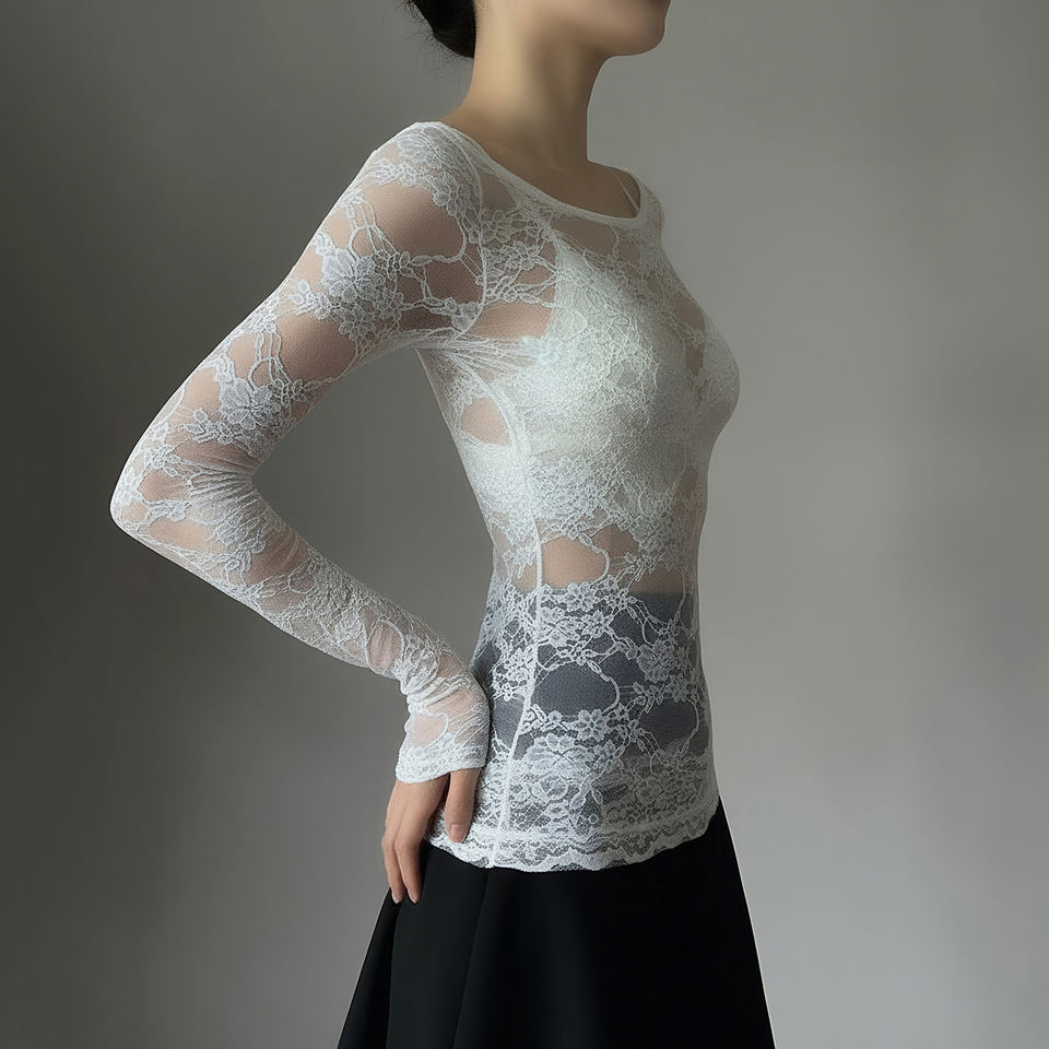 T-shirt à manches longues sexy en dentelle transparente à superpositions de style chic français, col rond, pour filles sexy