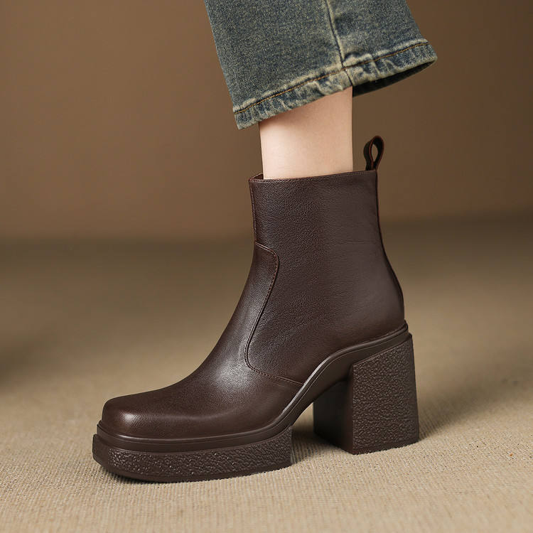 Bottines à talon carré en cuir véritable de style rétro classique français, couleur unie, couture, semelle extérieure en caoutchouc, mode pour femme