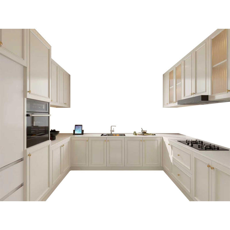 Meubles de cuisine de style français en forme de L, base en bois massif, armoire modulaire avec plan de travail en quartz pour cuisinière domestique