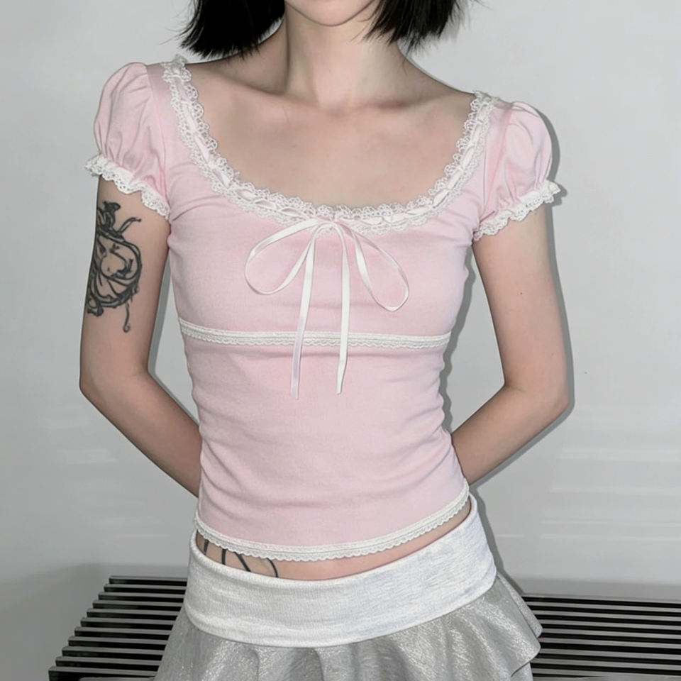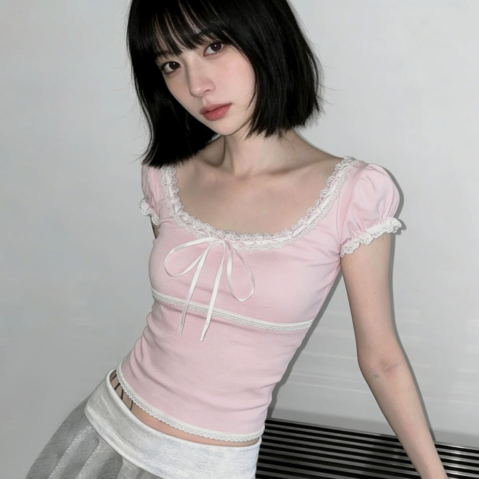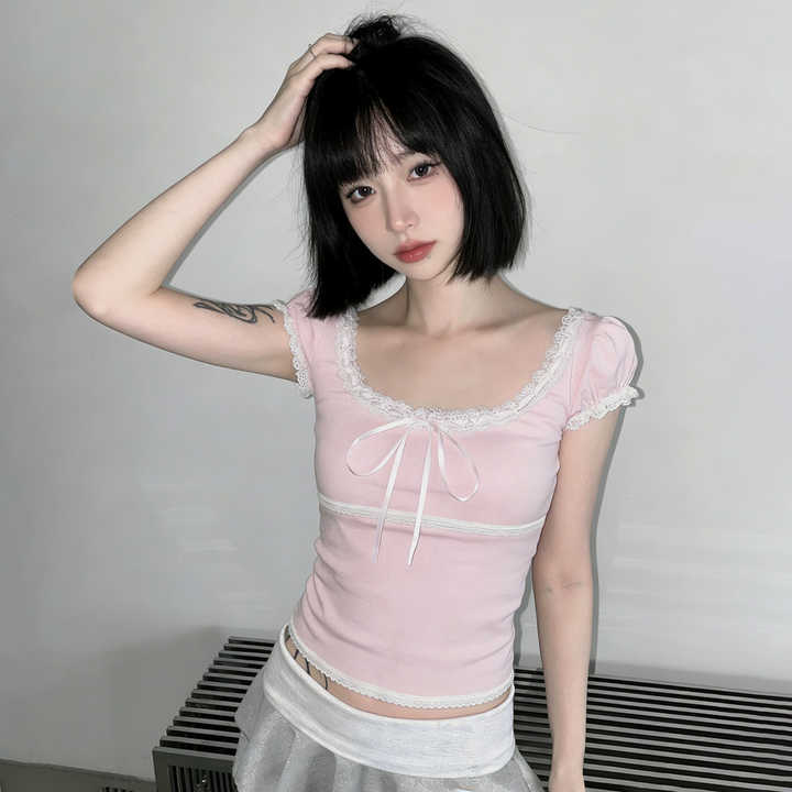 T-shirt rose frais à col carré avec dentelle, nœud papillon, manches bouffantes courtes, haut d'été mignon et ludique