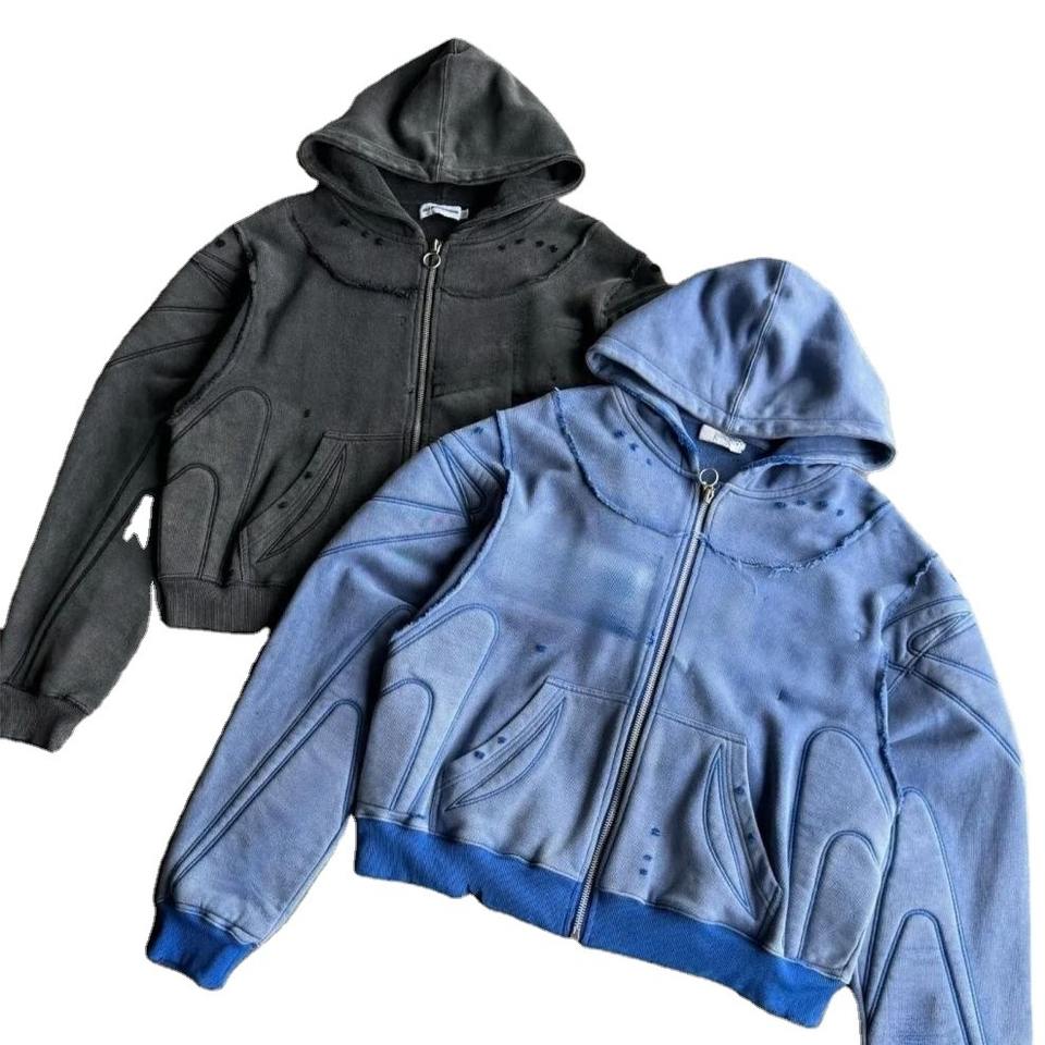 Sweat-shirt à capuche oversize en molleton français lourd, style frais, prix de gros, hommes, épaules tombantes, fermeture éclair, broderie