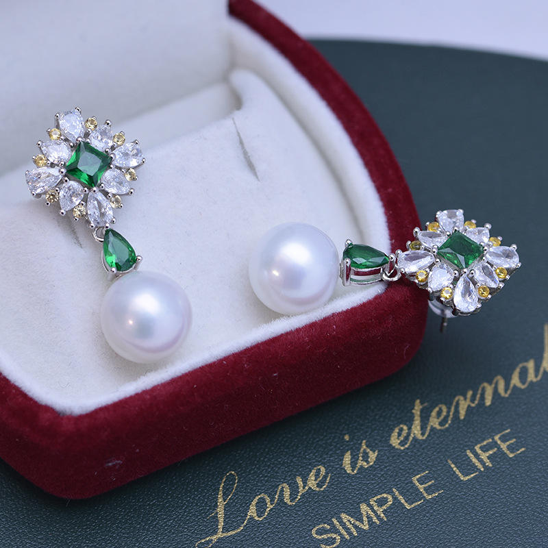 Freshwater 11-12mm White Round Pearl Earrings for Women S925 Silver Butterfly Dangle Eardrops with Strong Light Fine Flaws