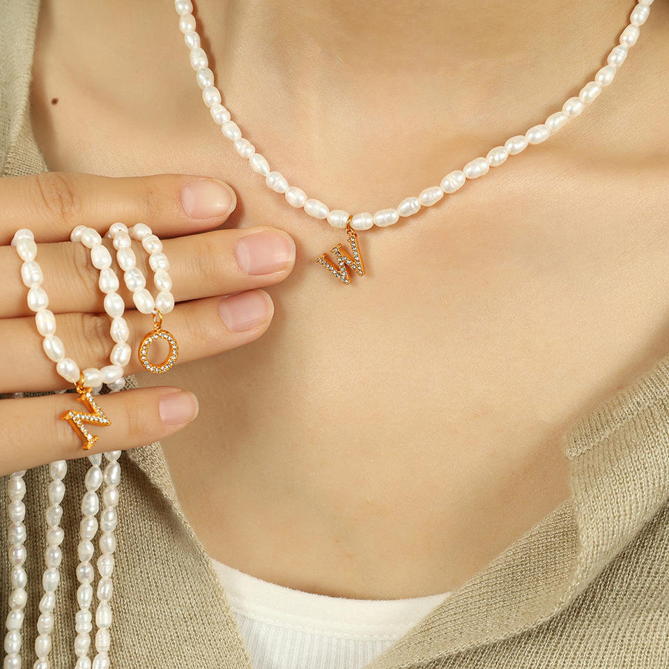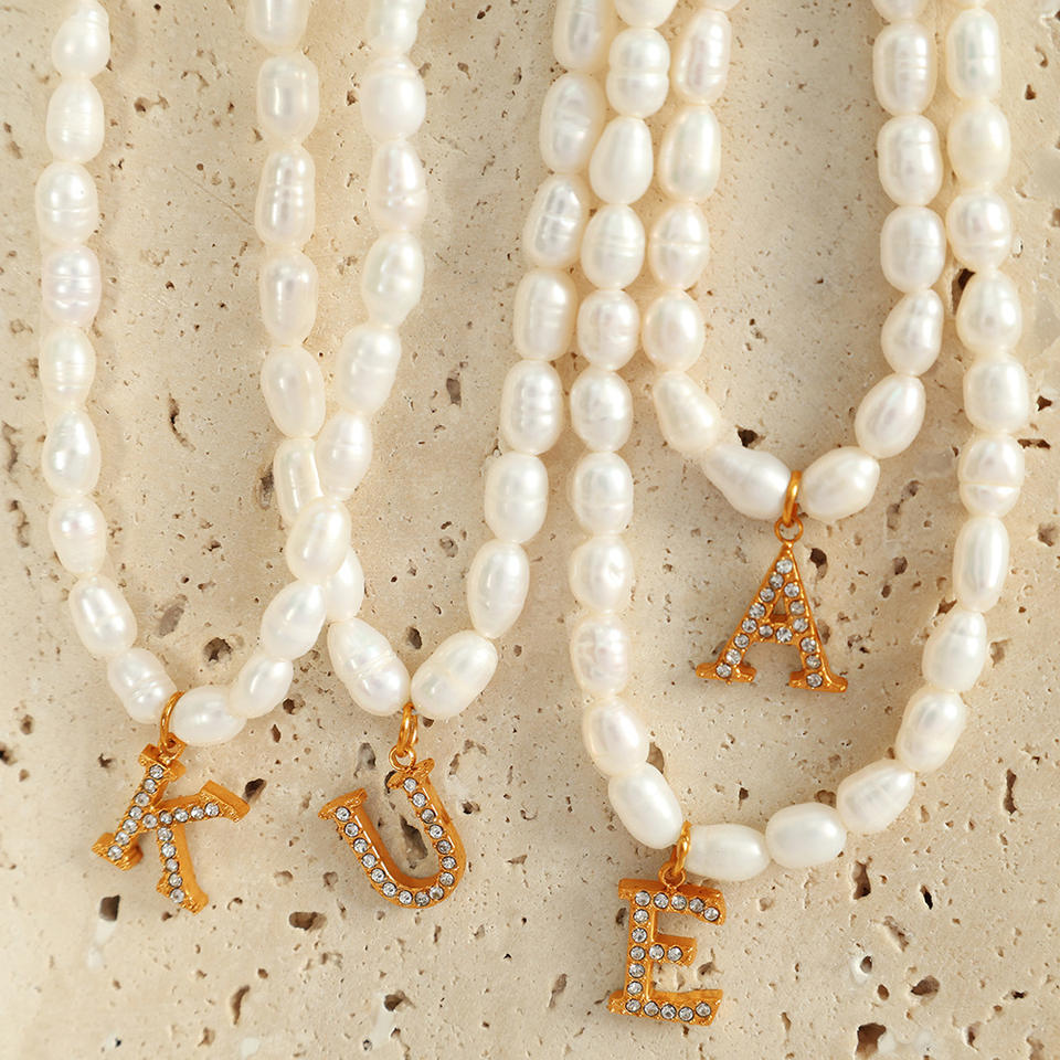 Collier de perles d'eau douce avec pendentif lettre en strass, bijoux en acier inoxydable, cadeau pour femme, colliers pendentifs tendance