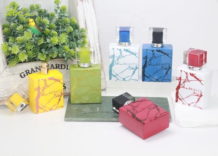 Flacons de parfum en verre coloré de haute qualité de 75 ml, jaune avec pulvérisateur et violet rouge avec décalcomanie et tête de pulvérisation