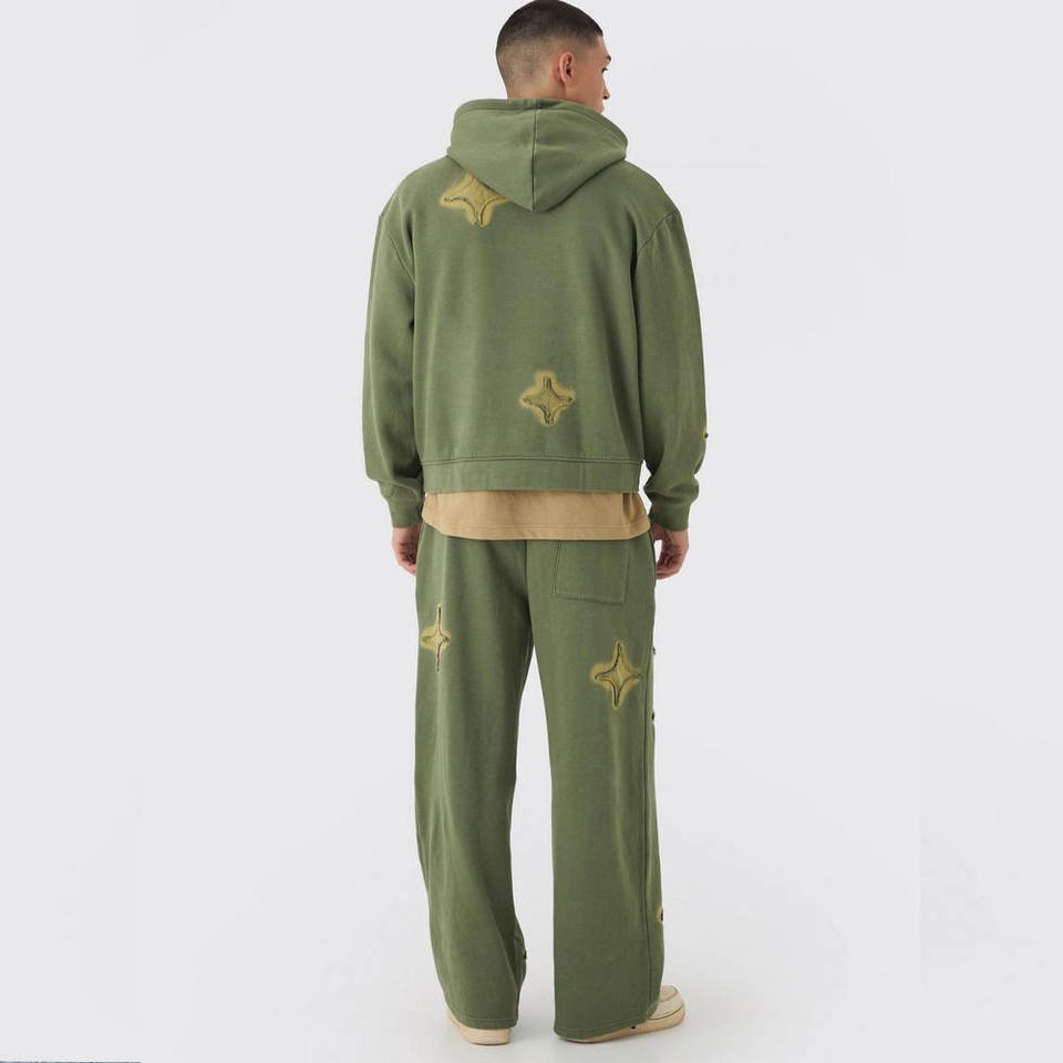 Survêtement d'hiver pour homme avec broderie solide devant et derrière, manches imprimées, effet vieilli, doublure intérieure en polaire et capuche amovible