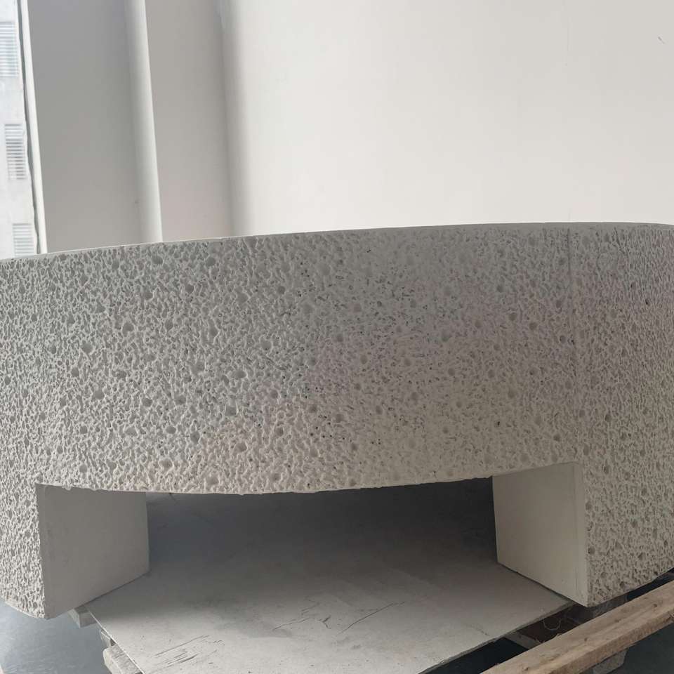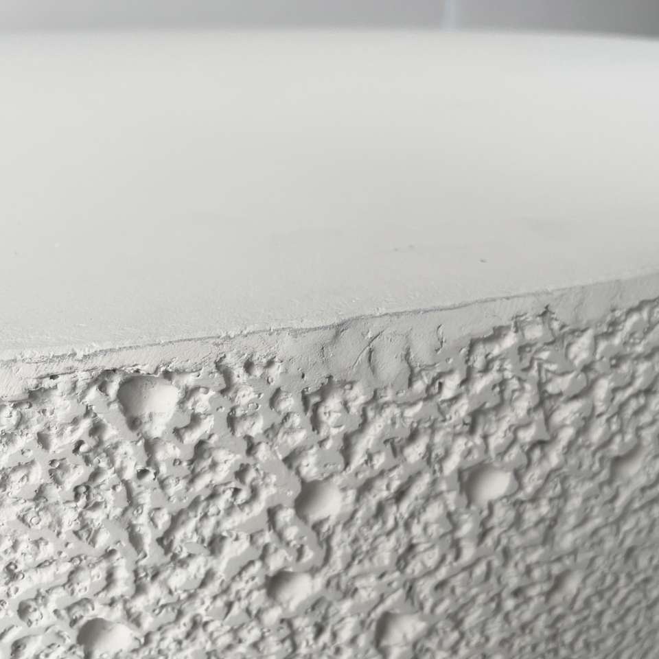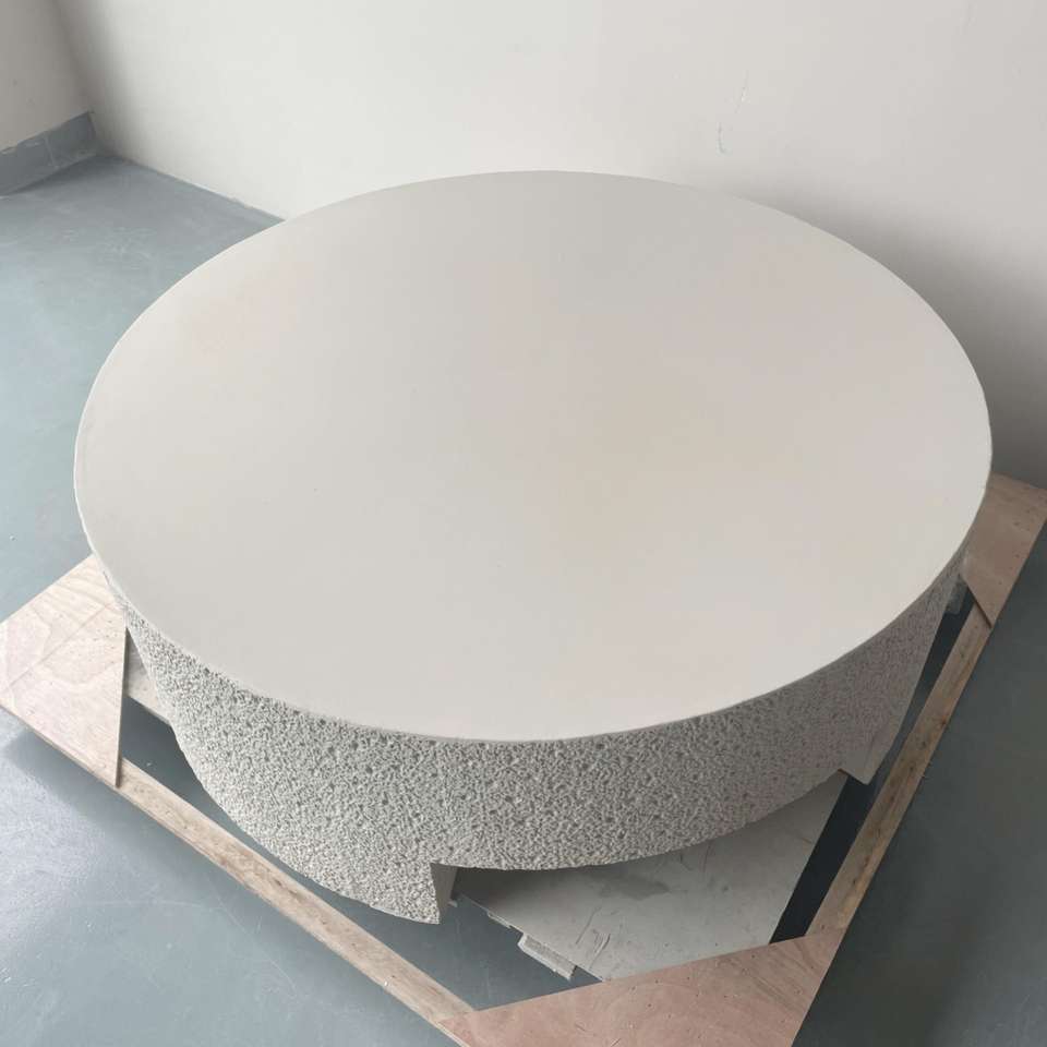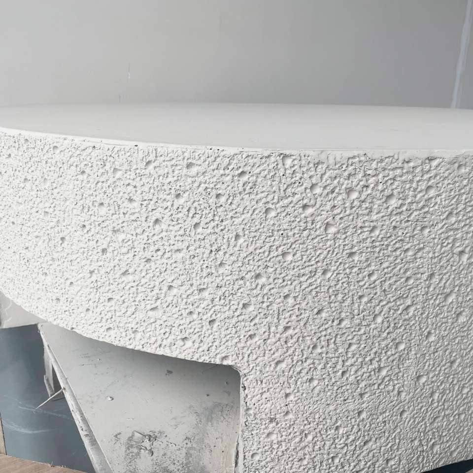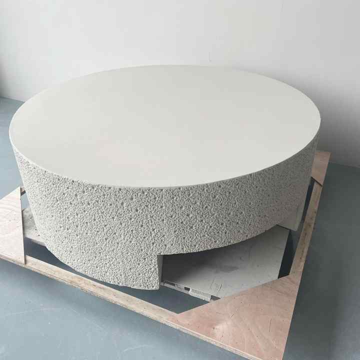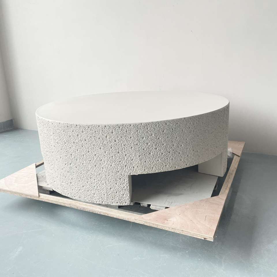 Table basse moderne légère en ciment beige, avec granulés givrés sur 3 côtés, pour café et restaurant