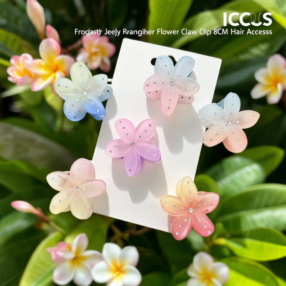 Pince à cheveux griffe fleur de frangipanier en gelée givrée avec strass, 8 cm