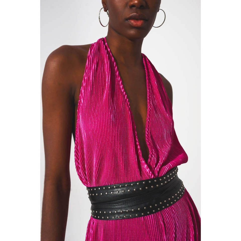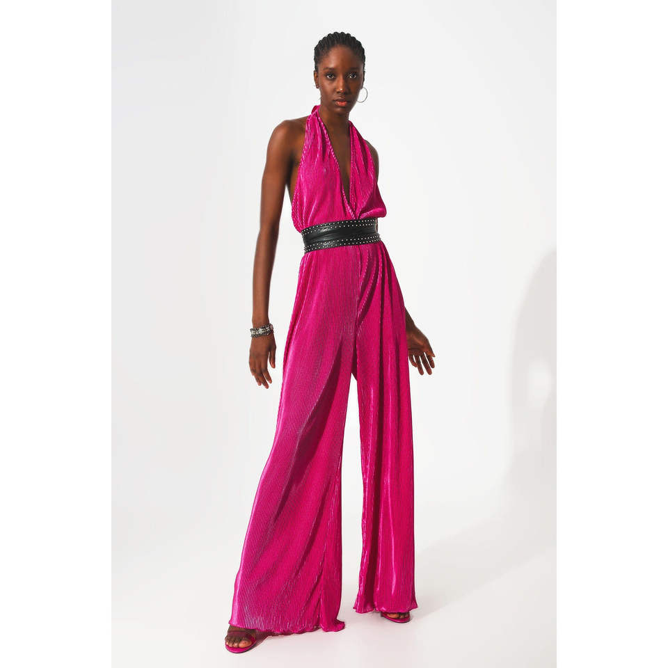 Combinaison longue fuchsia en satin à col halter, plissée, coupe décontractée, manches larges, taille haute, idéale pour les soirées