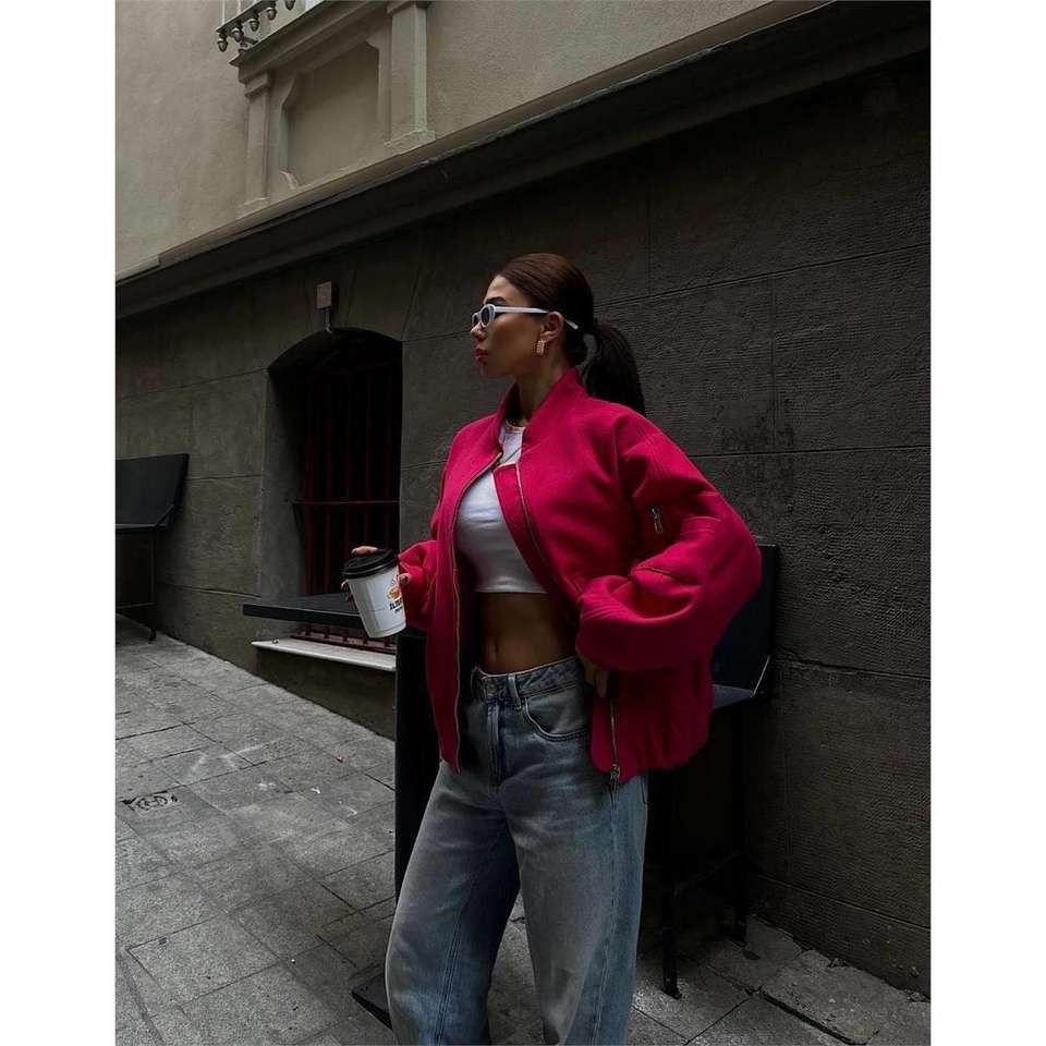 Veste aviateur en cachemire pour femme, fermeture éclair fuchsia