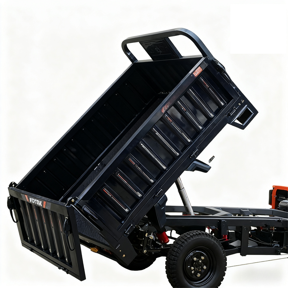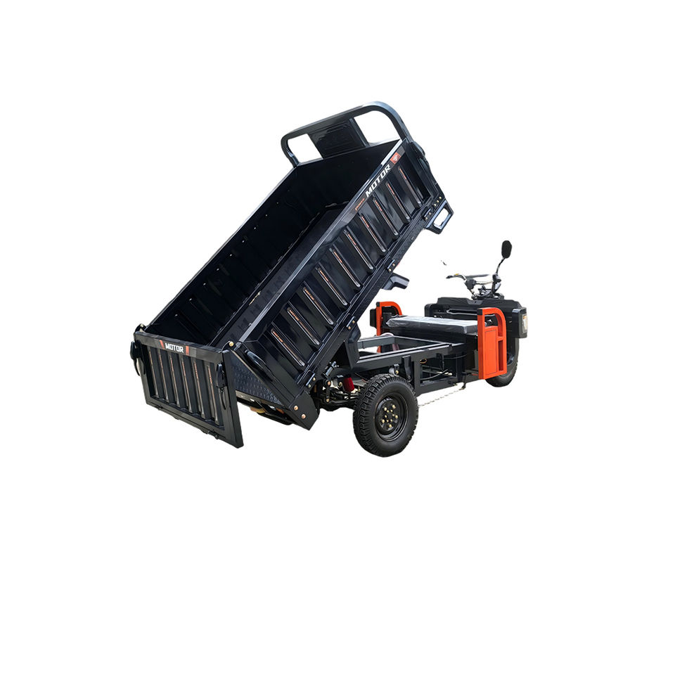 Tricycle cargo hybride électrique polyvalent avec benne basculante hydraulique et utilisation pour machines de chantier ou DLS