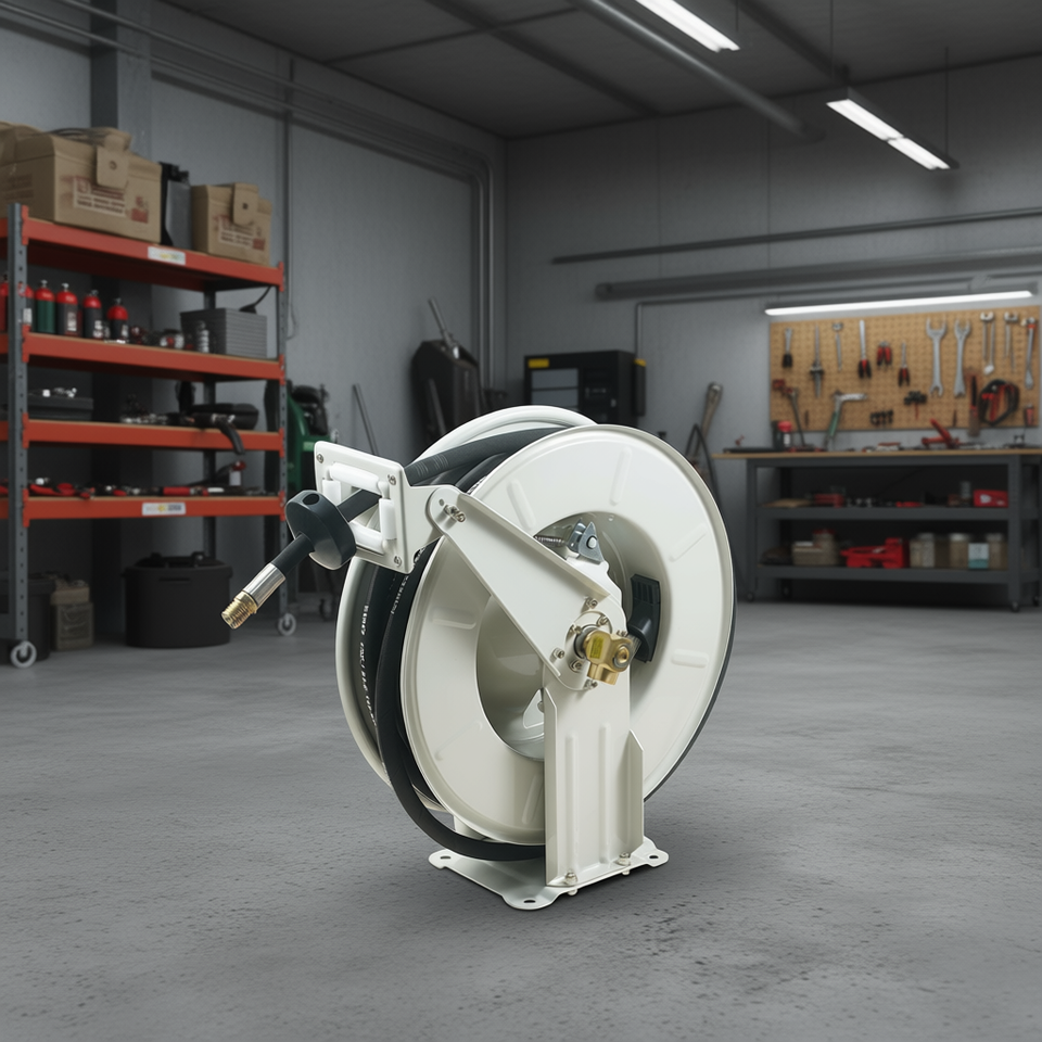 Enrouleur de tuyau de carburant 1/2 po x 50 pi à ressort, rotation automatique, enroulement robuste, en acier au carbone, pour usage industriel et carburant
