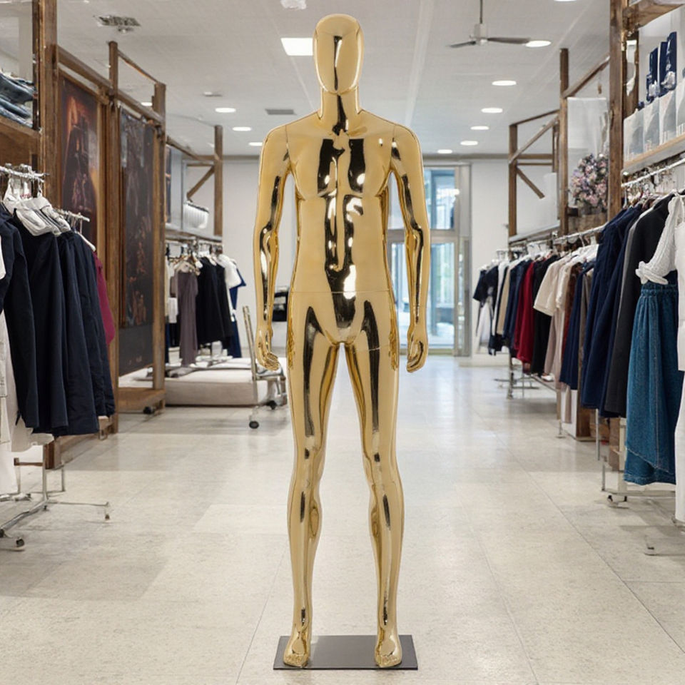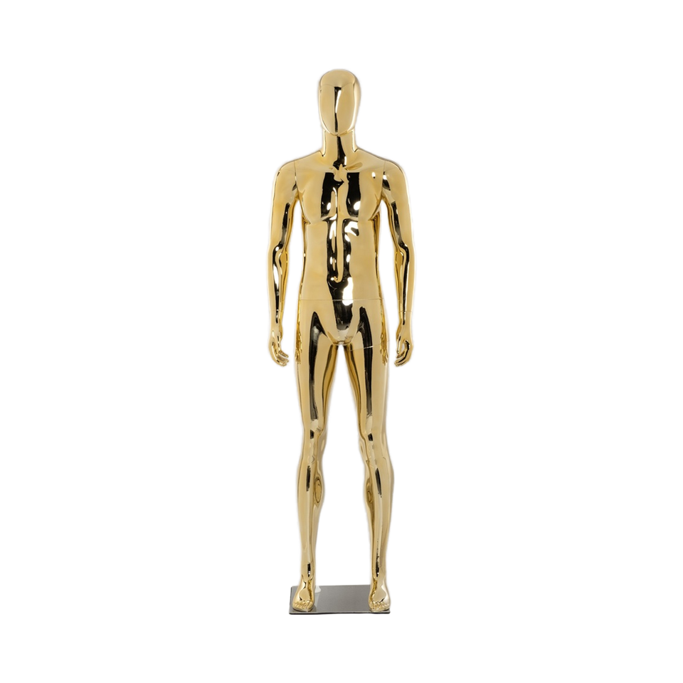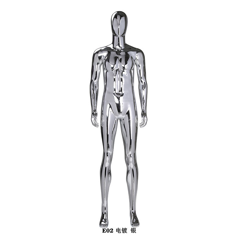 Mannequin abstrait de fenêtre musclée en plastique pour homme complet avec tête d'oeuf et finition chromée brillante argent métallique