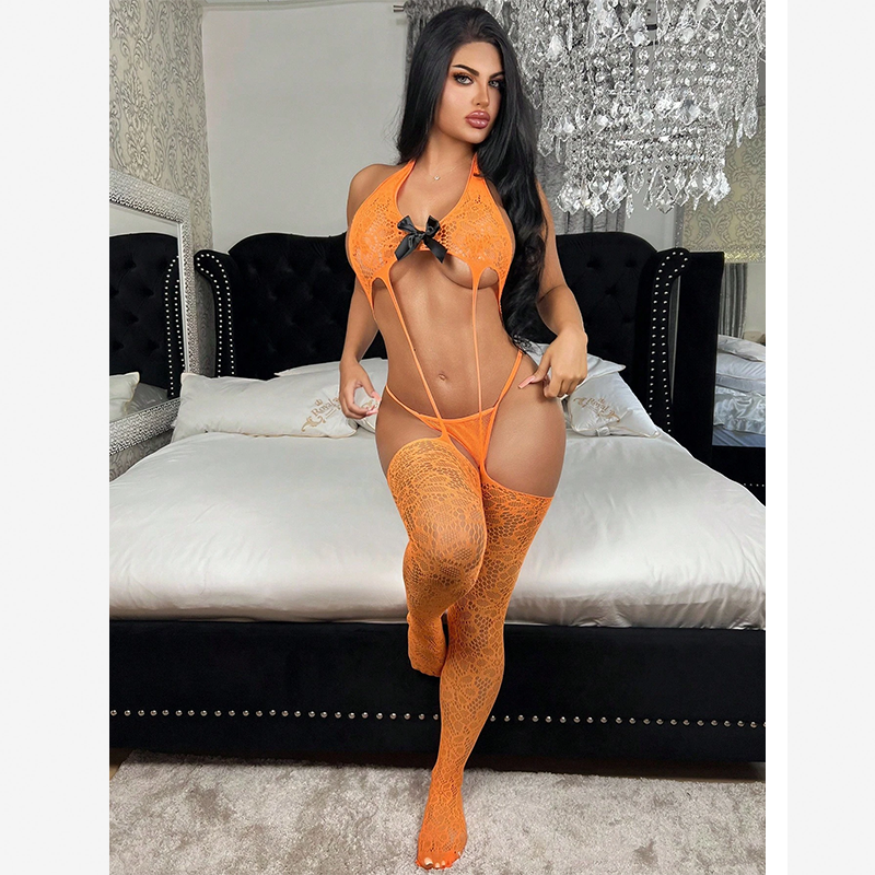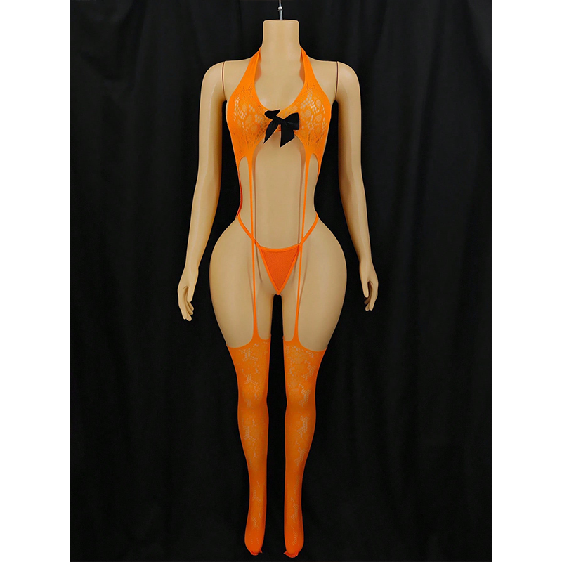 Ensemble de lingerie dos nu orange à nœud à la mode avec tissu en maille transparente et détails évidés pour femmes