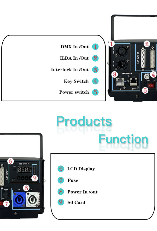 ILDA, DMX, SON, AUTO, MAître/ESclave/SD