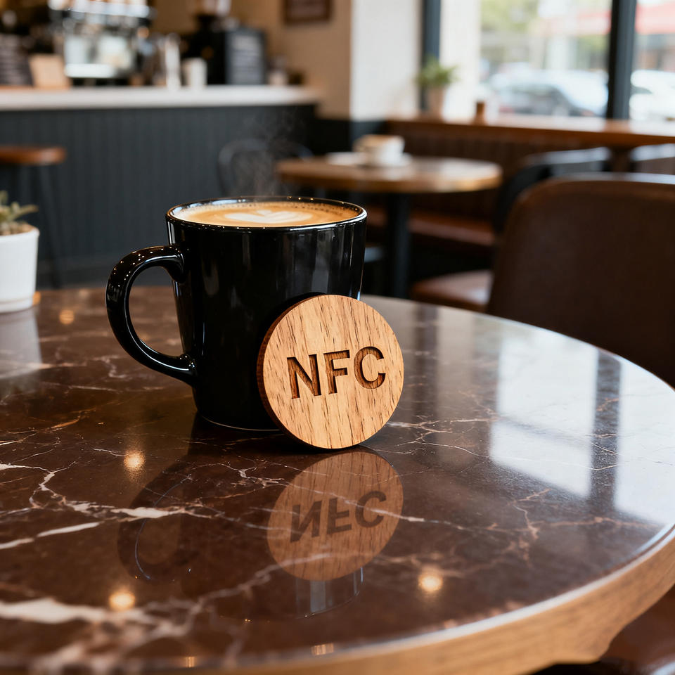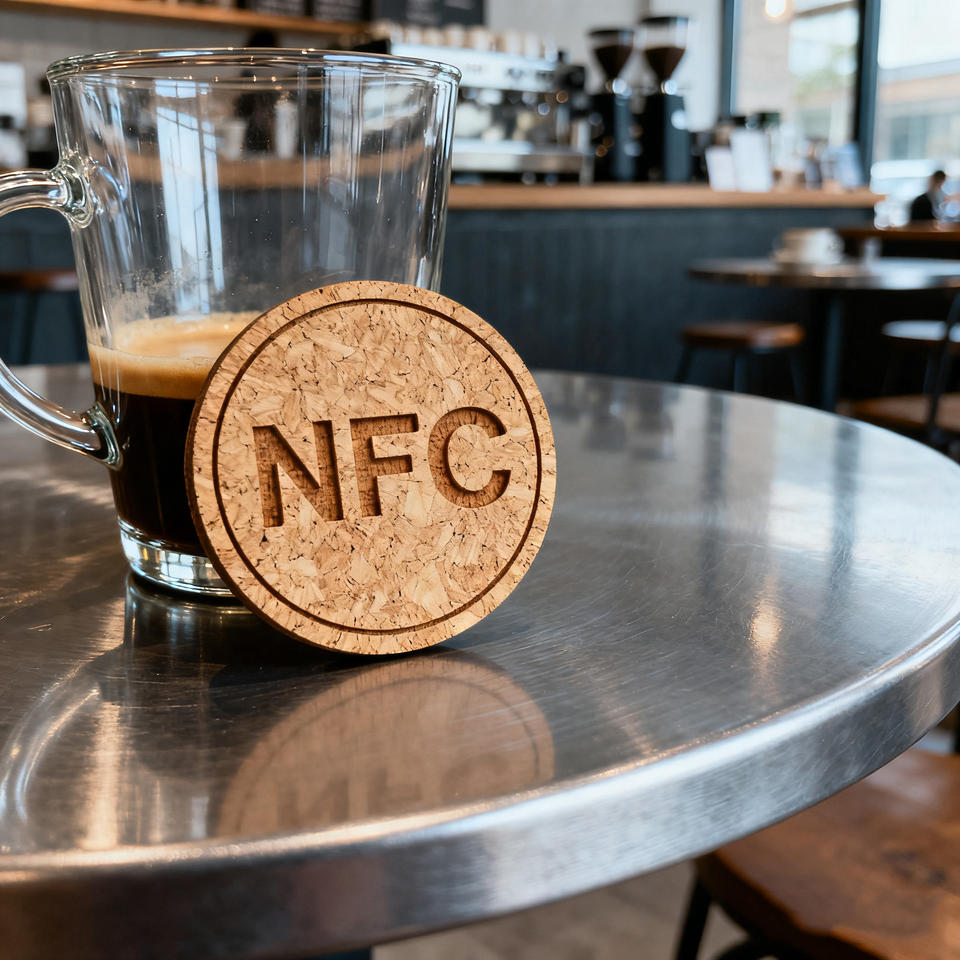 Sous-verre en bois avec impression couleur, puce RFID NFC intégrée, pour commande et paiement, avec fonction Wi-Fi