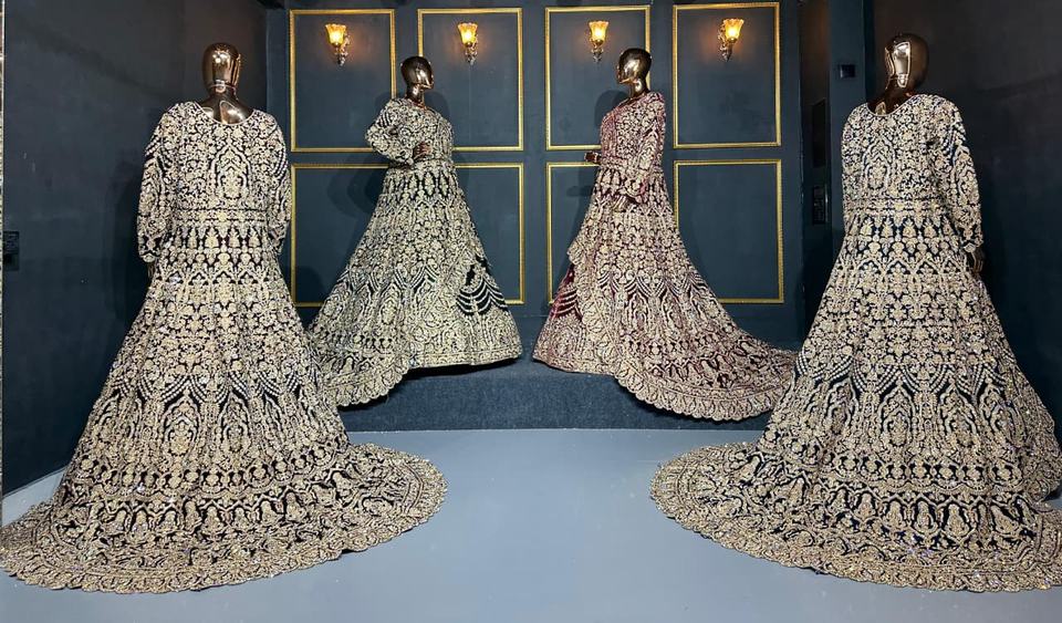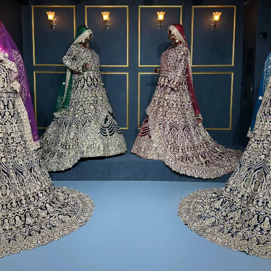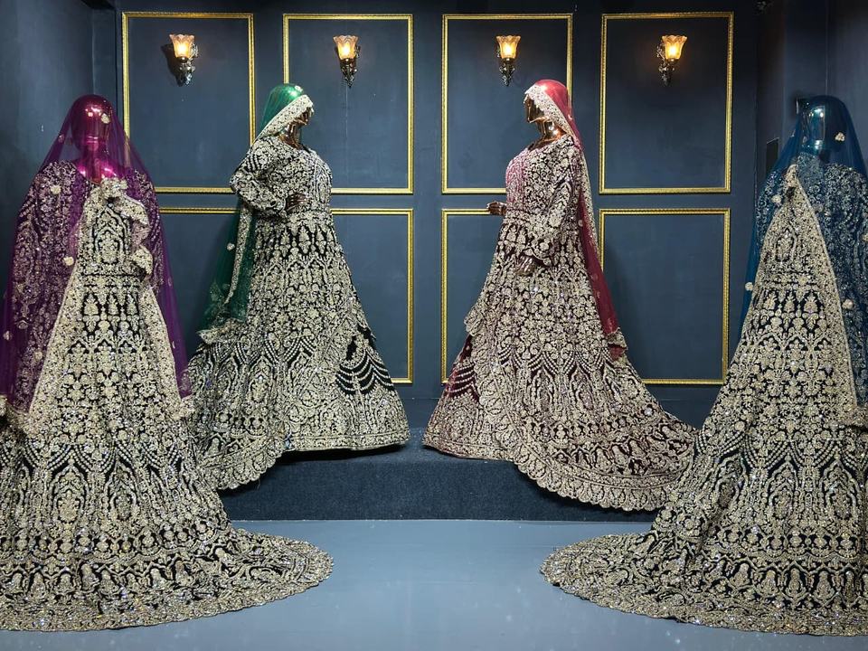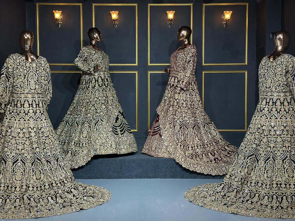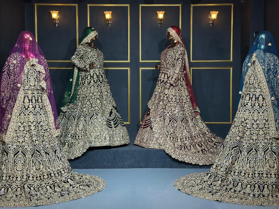 Lehenga en velours de travail lourd complet avec des détails riches en longs sentiers et des pierres Jarkan étincelantes pour la mariée et la fête