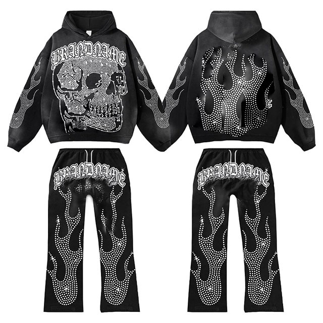 Survêtement évasé complet avec logo personnalisé en strass pour hommes Ensemble de survêtements avec impression bouffante Survêtement en polaire lourd 400GSM