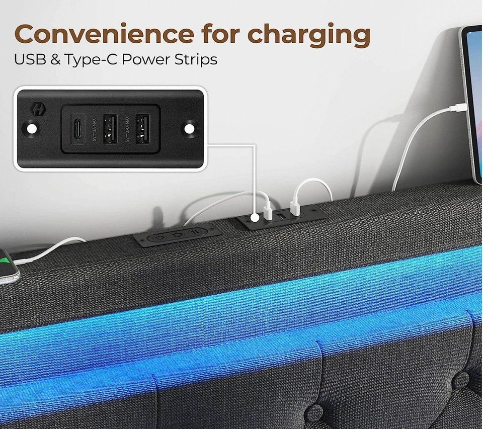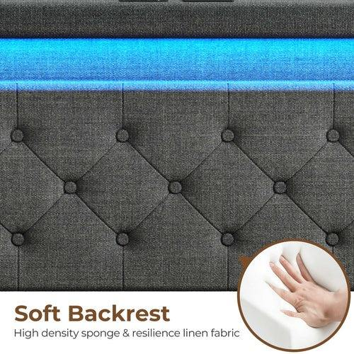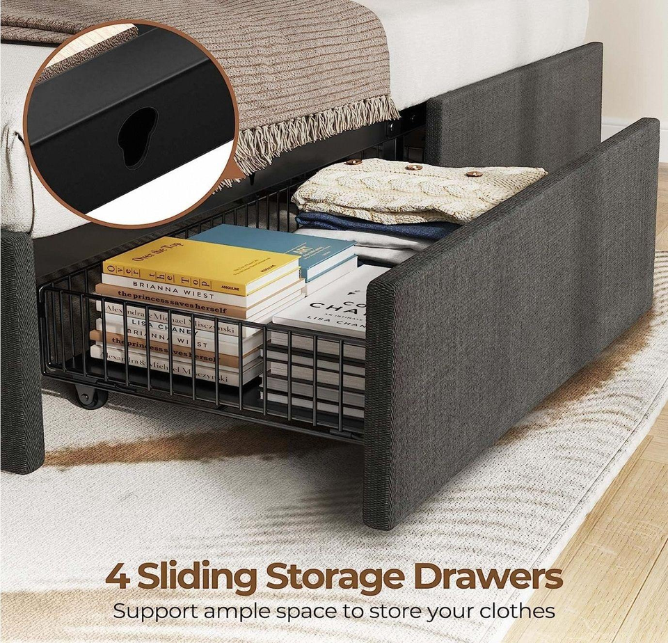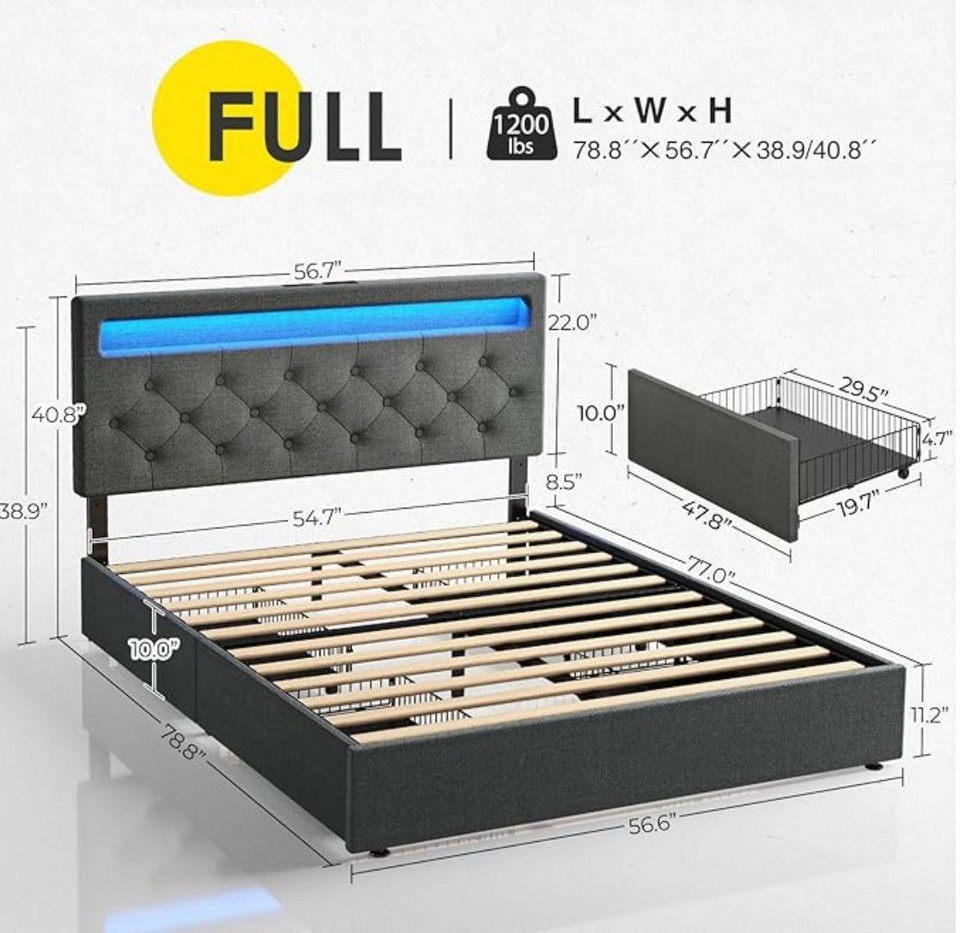 Full Size Bed Frame with Charging Station and LED Lights, Upholstered Fabric Bed with Adjustable Headboard and 4 Storage Drawers