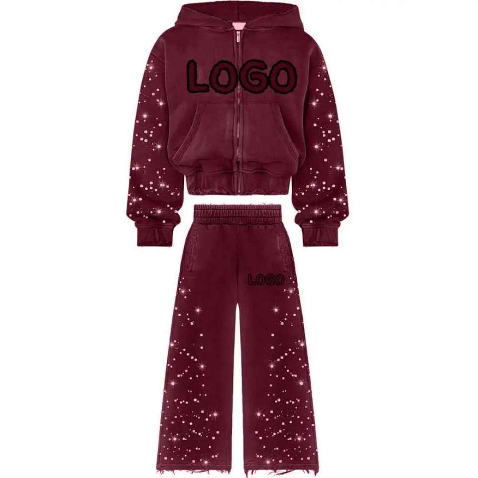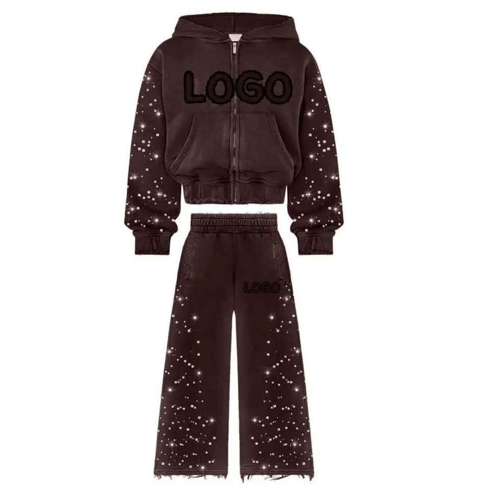 Ensemble de survêtement à manches longues avec fermeture éclair et strass, en coton extensible et doux, tenue de survêtement avec strass