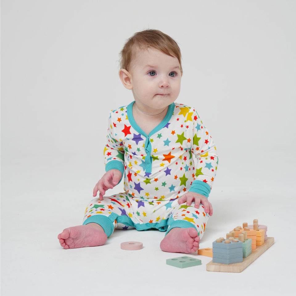 Combinaison bébé personnalisée à manches longues avec imprimés étoiles, en coton et bambou, avec fermeture éclair, vente en gros