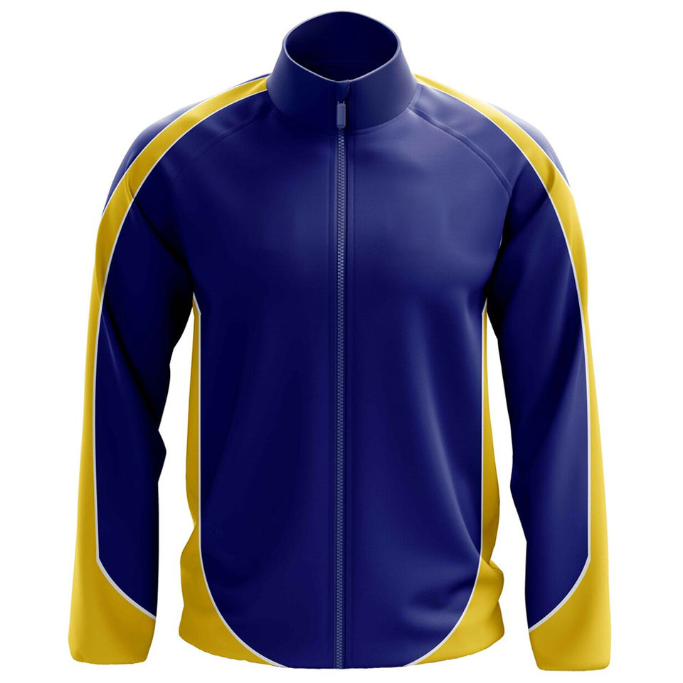 Veste Softshell d'Hiver en Toile Bleu Foncé et Jaune à Col Montant, Personnalisable avec Nom d'Équipe par Sublimation, Meilleure Vente pour Activités de Plein Air