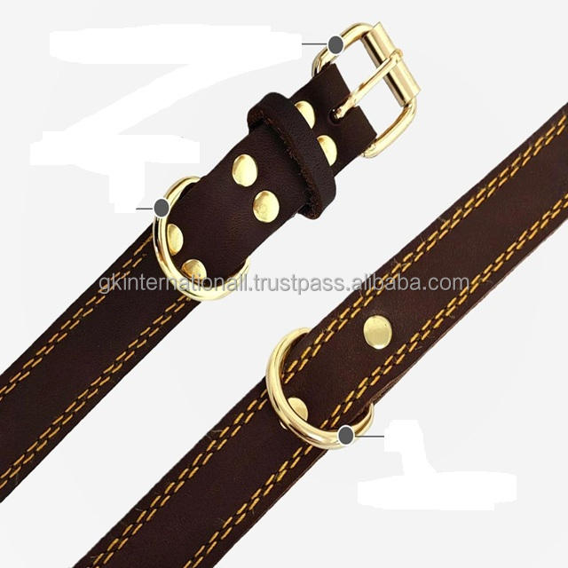 Full grain Genuine Leather dog collar with double stitching and heavy duty adjustable brass buckle D ring and Nickel
