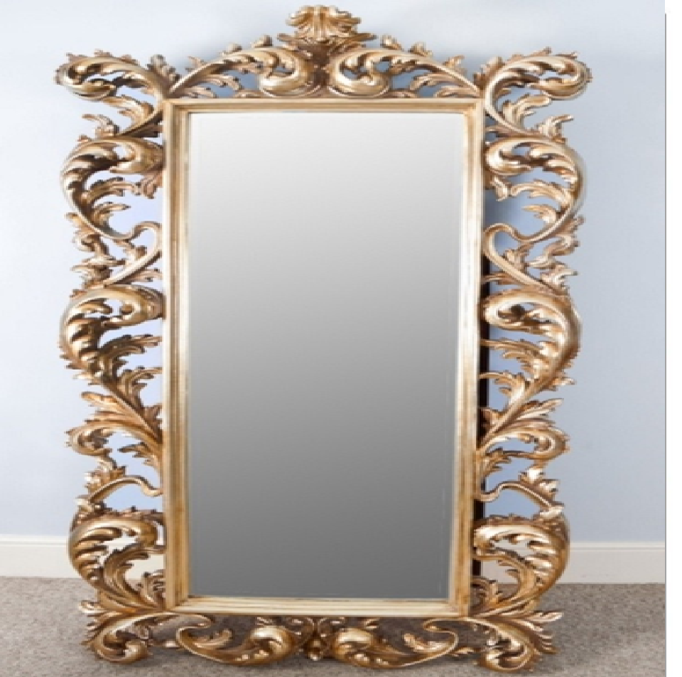 Miroir rectangulaire doré pleine longueur avec de riches gravures d'acanthe ; disponible à prix de gros.