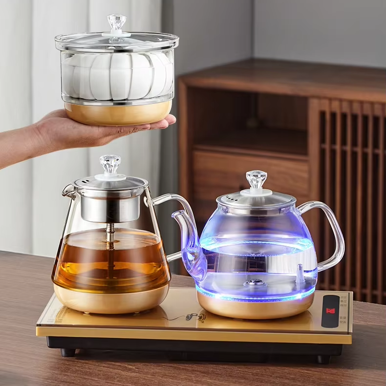 Bouilloire électrique en verre entièrement automatique à remplissage par le bas avec table à thé intégrée et chauffe-thé à induction